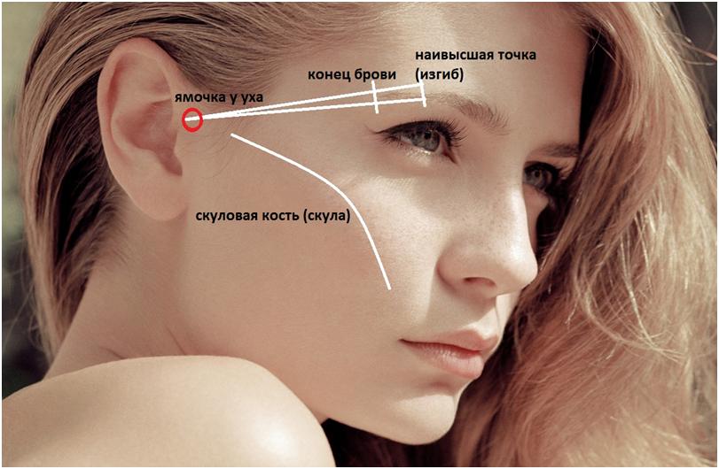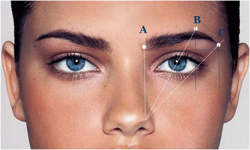 берёт в ладошку карандаш для бровей и соединяет им точку у носового крылышка и точку у внутреннего глазного угла (линия А). !!!! Точка пересечения карандашика с бровкой (линия А) считается отметкой, в которой бровная дуга берёт своё начало;