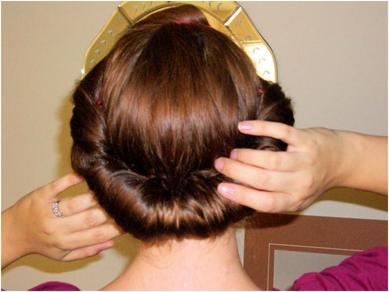 Нужно тщательно расчесать волосы, которые собирают в низкий хвост, и закрепляют резинкой. Следует ослабить резинку и проделать углубление на волосах таким образом, чтобы они разделились на две половинки. После этого, пропустите хвост в получившееся отверстие, а потом скрутите в жгут. Конец хвоста спрячьте внутри ролла. Завершающий этап – закрепление прически с помощью шпилек.