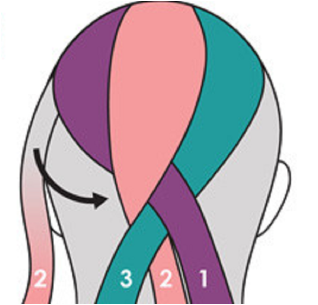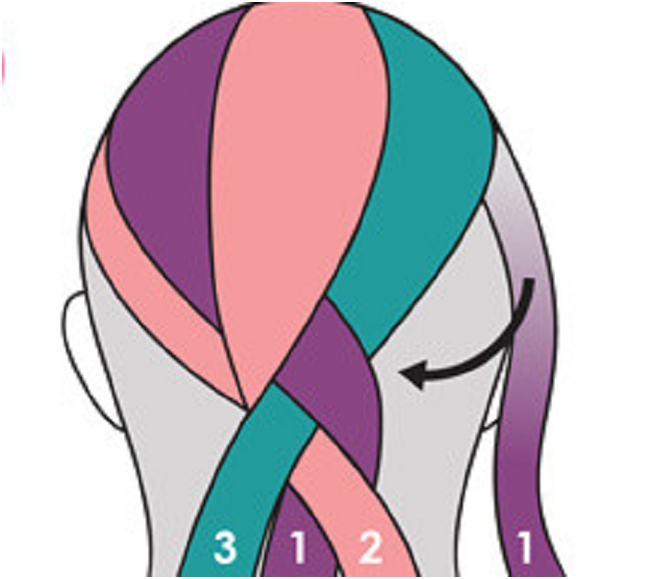 Теперь вторую прядь подводим под третью и выводим ее наружу между первой и третьей прядями. Ко второй пряди добавляется часть волос с левой стороны головы. Таким образом приплетаются боковые волосы.