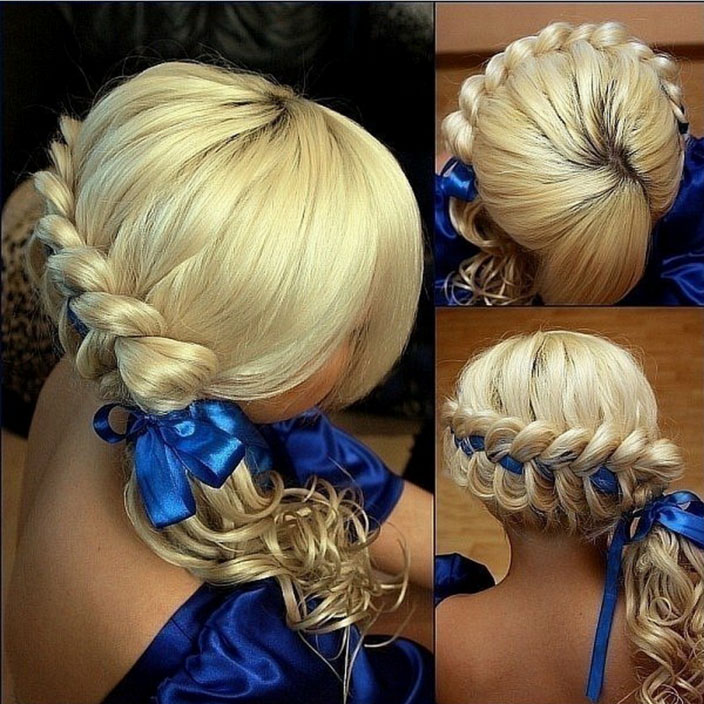 Для торжественного мероприятия или романтического ужина отлично подойдет прическа, в которой пучком заканчивается французская коса, оплетающая голову. Но на ее создание приготовьтесь потратить некоторое время и внушительный запас шпилек.