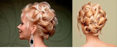 - Высокие локоны выполняются с помощью бигуди. Затем пряди собираются на затылке и поднимаются вверх. Прическа крепится заколками и лаком.