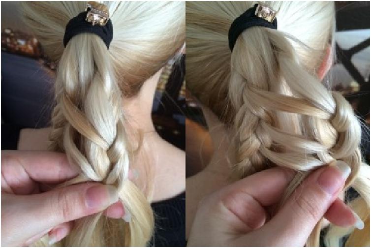 - Крайняя прядь пропускается под центральной и накидывается поверх крайней пряди с противоположной стороны.