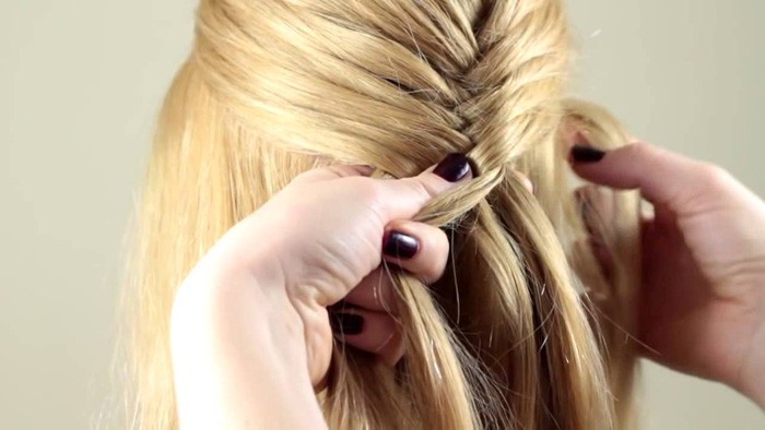 - С наружного края одной стороны отделяется небольшая прядь и накрест перекладывается на противоположную сторону.