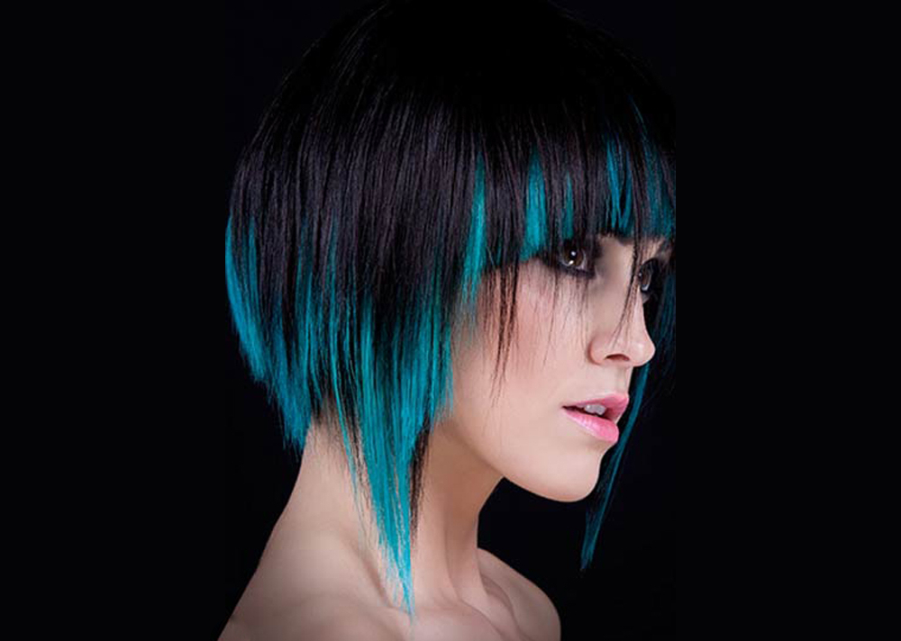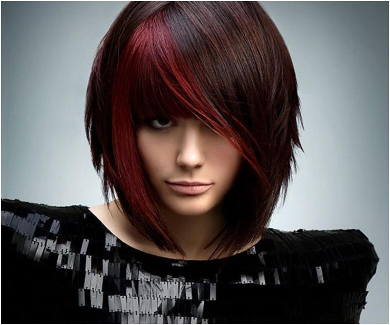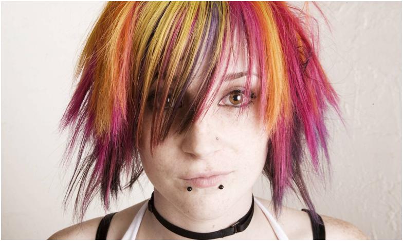 После стрижки можно приступать к покраске. Выбирается любой тёмный цвет по желанию. Окрашиваются все локоны. Затем выбирается одна прядь или несколько и окрашивается в яркий цвет.