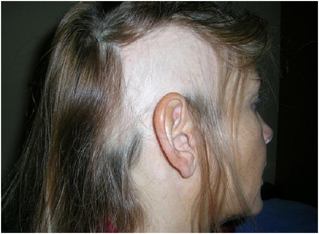 Это наименее изученный тип алопеции. На волосистой части головы появляется один или несколько очагов облысения. Кожа на этих маленьких пятнышках не имеет рубцовой ткани, не меняет цвет и текстуру, однако волосы выпадают, а по краю пораженной области легко и безболезненно выдергиваются.