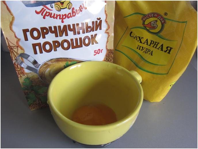 Для приготовления маски смешайте горчичный порошок (4 ст.л.) и 2 желтка. В смесь добавьте теплую воду (4 ст.л.), тщательно перемешайте ингредиенты.