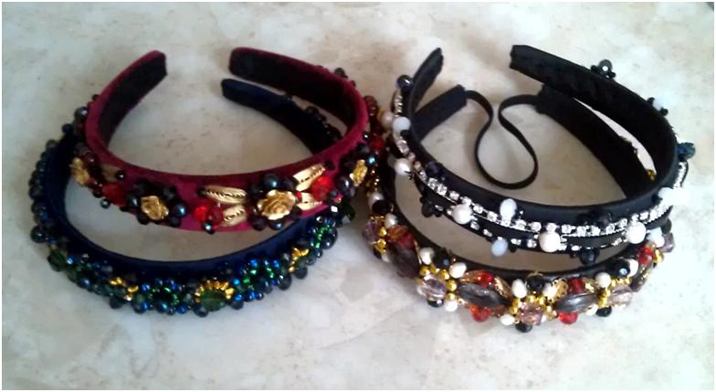 Ободки с камнями (стразами) – праздничный или вечерний вариант. Стразы бывают разного размера, цвета. Крепятся по отдельности или на основу для формирования крупного элемента. Как и цветы крепятся на резинку, повязку или плотную основу.