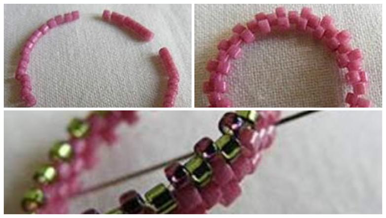 - Из бисера большего размера сплетите круглую цепочку. Для этого нужно нанизывать по кругу бисеринки, через одну пряча леску в бисеринку предыдущего ряда. Цвета можно комбинировать.
