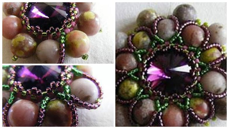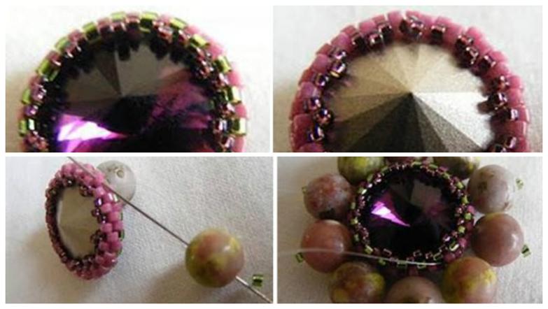 - В получившуюся оправу вставьте стразу и с помощью мелкого бисера закрепите, затянув круг с двух сторон.