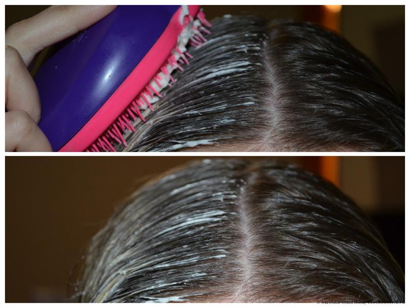 полученный состав наносит на не помытую, но расчёсанную шевелюру расчёской с редкими зубьями;